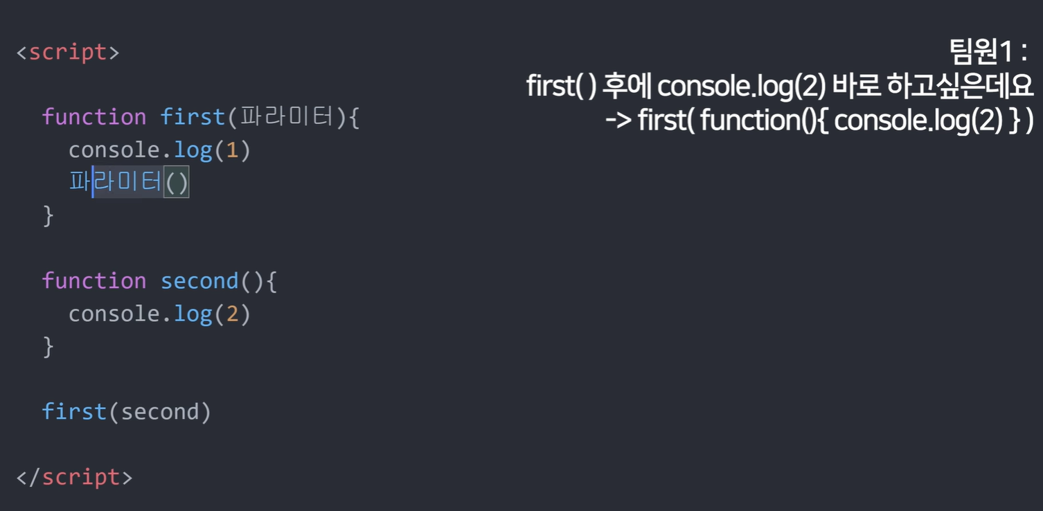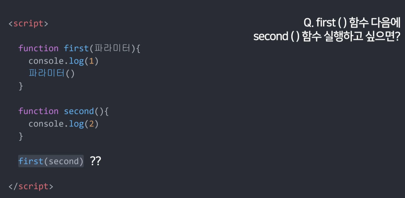 그러면 무조건 파라미터() 부분에서 실행을 할 수 있겠죠. first 함수 console.log(1) 실행하고나서