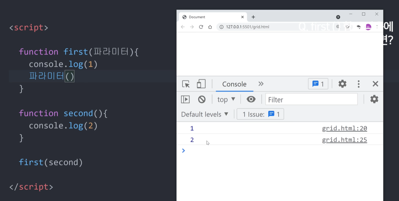 첫번째 줄 ( console.log(1) ) 실행이 되고나서 그 다음줄로 ( 파라미터() ) 실행이 되겠지요.