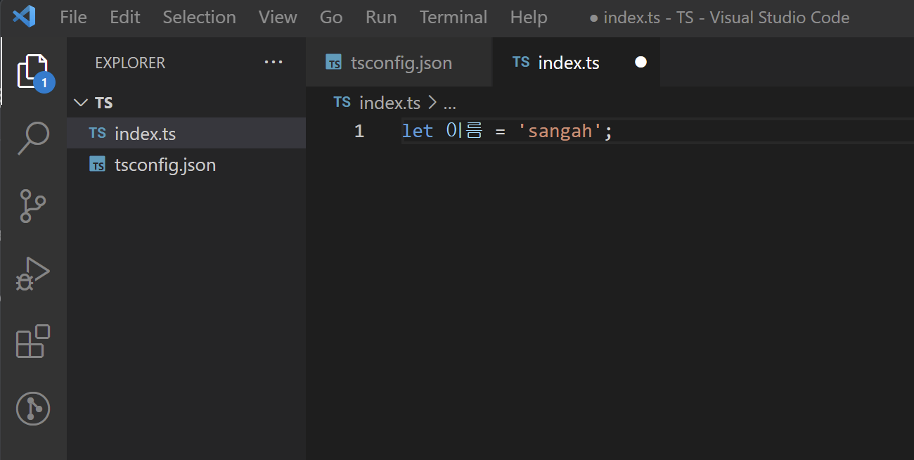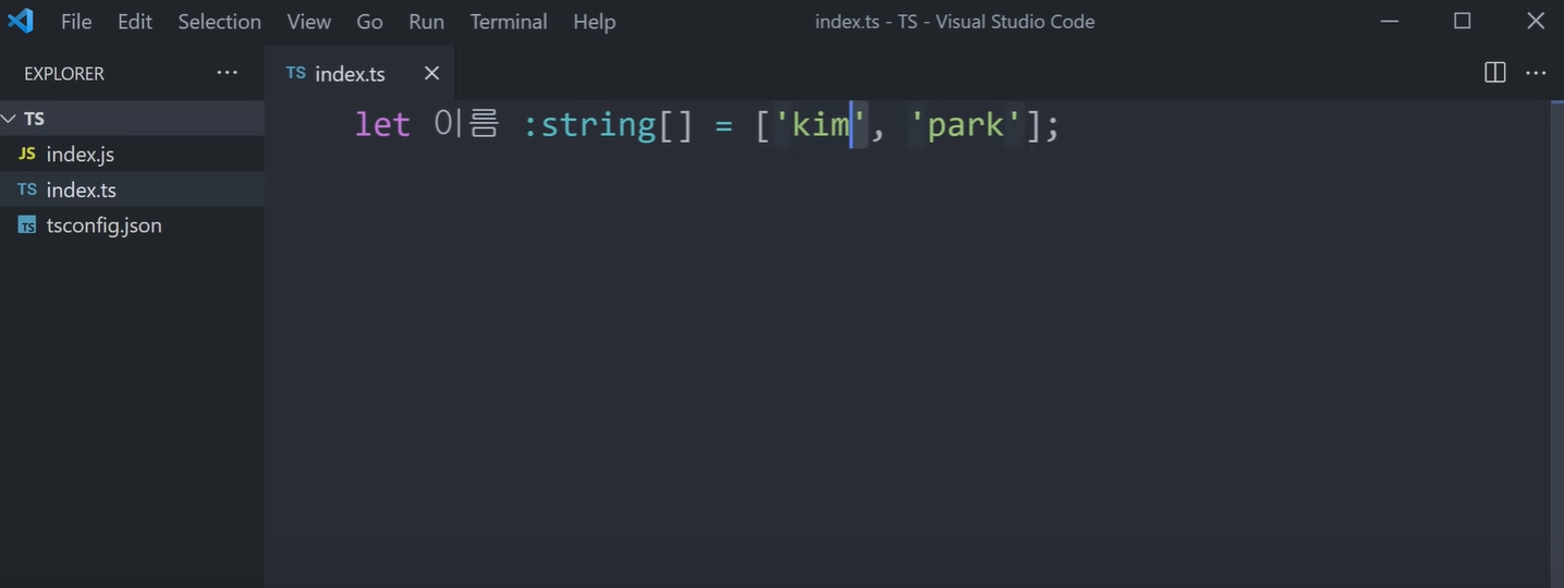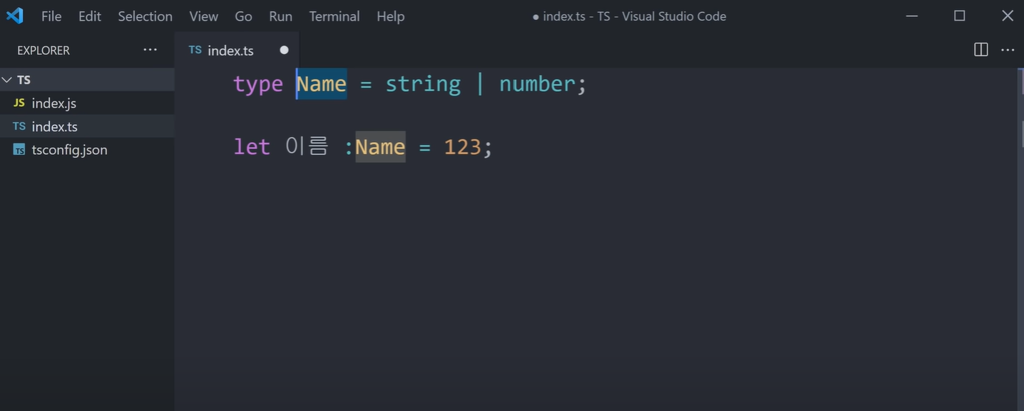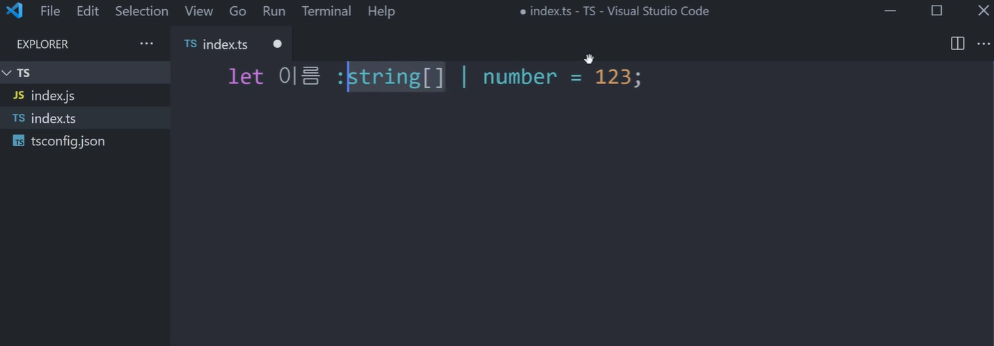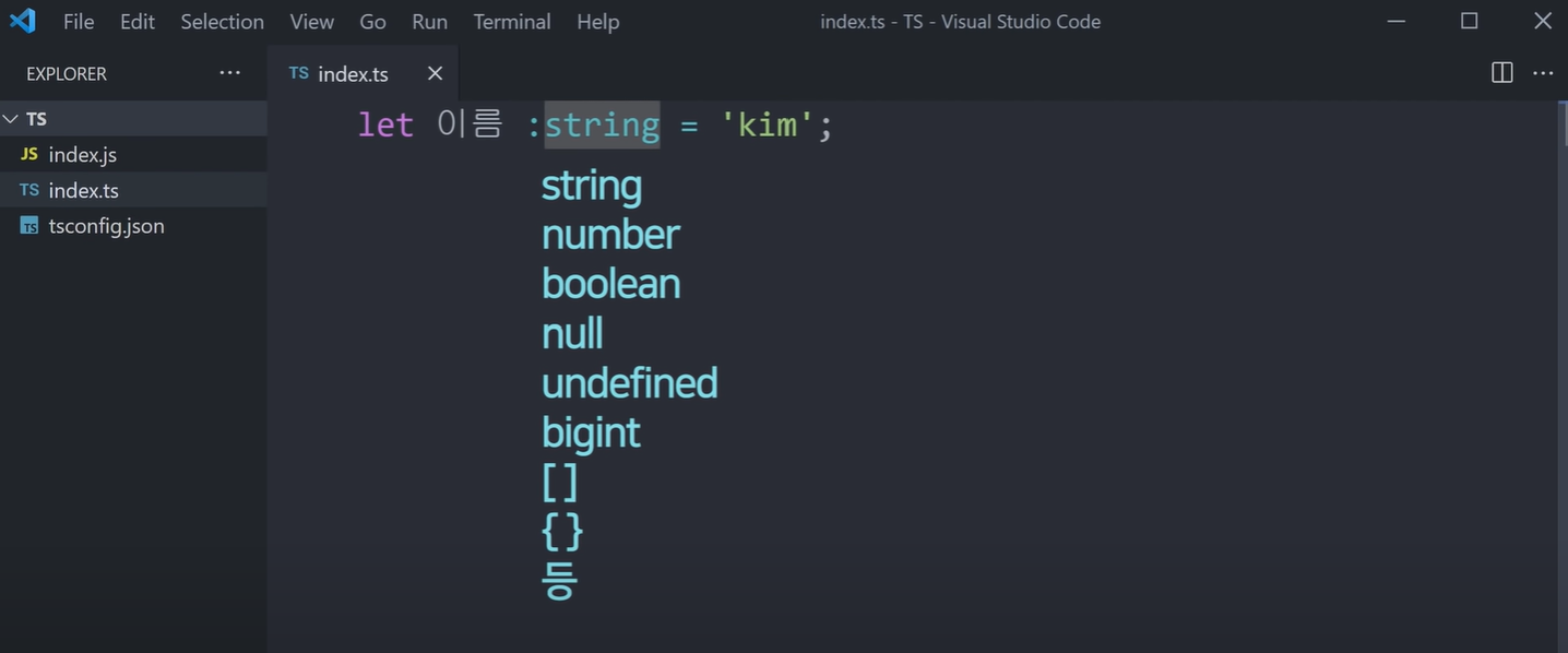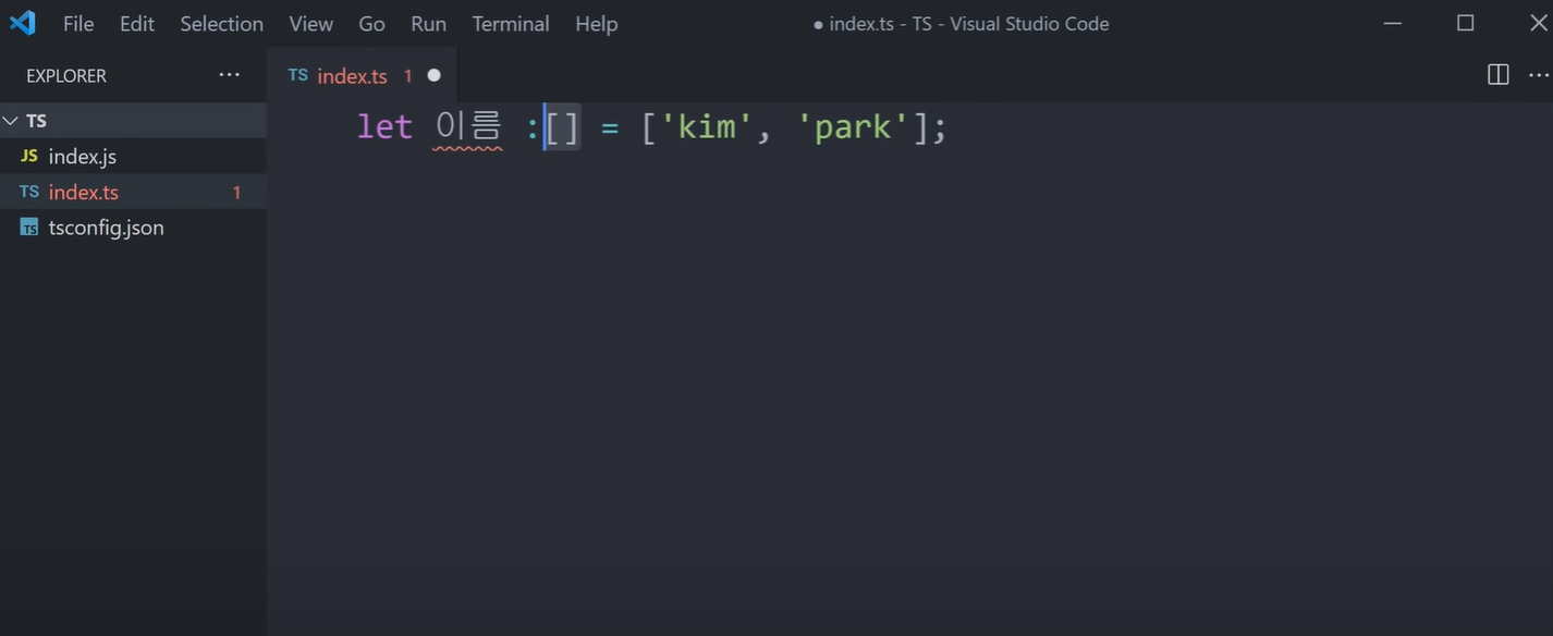 자, 이제 js 파일이 아니라 ts (타입스크립트) 파일을 하나 만들어요. index.ts .ts로 끝나면,