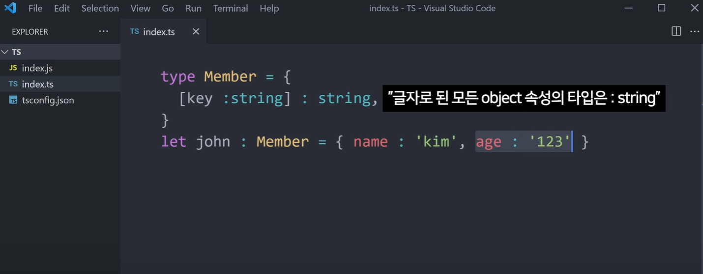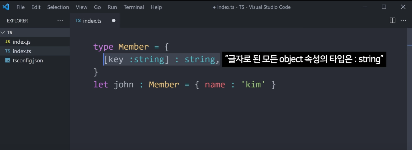 무조건 문자로 이렇게 들어온 속성들이 전부 다 string을 가져야 한다는 뜻으로 이런식으로 코드를 짤 수 있습니다.그러면 이제 속성들을 자유롭게 많이 써도 [key : string]에 걸리기 때문에 귀찮게 하나하나 지정할 필요가 없어지는 겁니다.