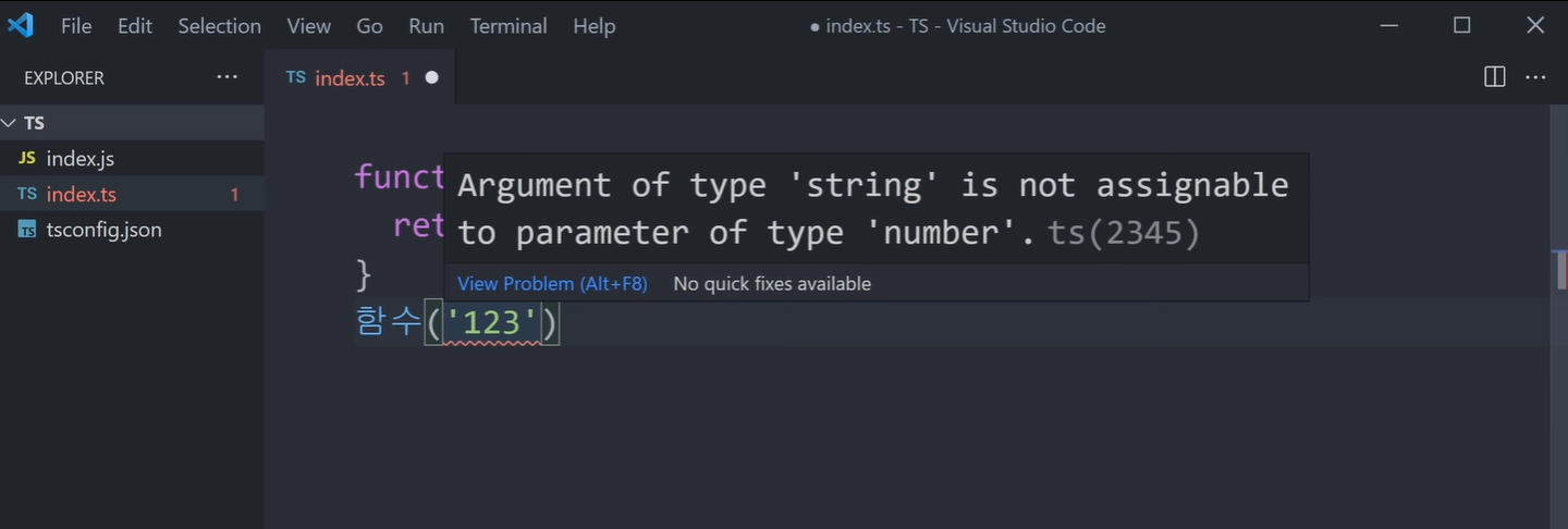 그리고 TS를 쓰는 또 다른 이유는 타입 부분을 엄격하게 짚어주는 것 덕분에 에러 메시지 같은 것도 정확하고 퀄리티가 좋습니다.