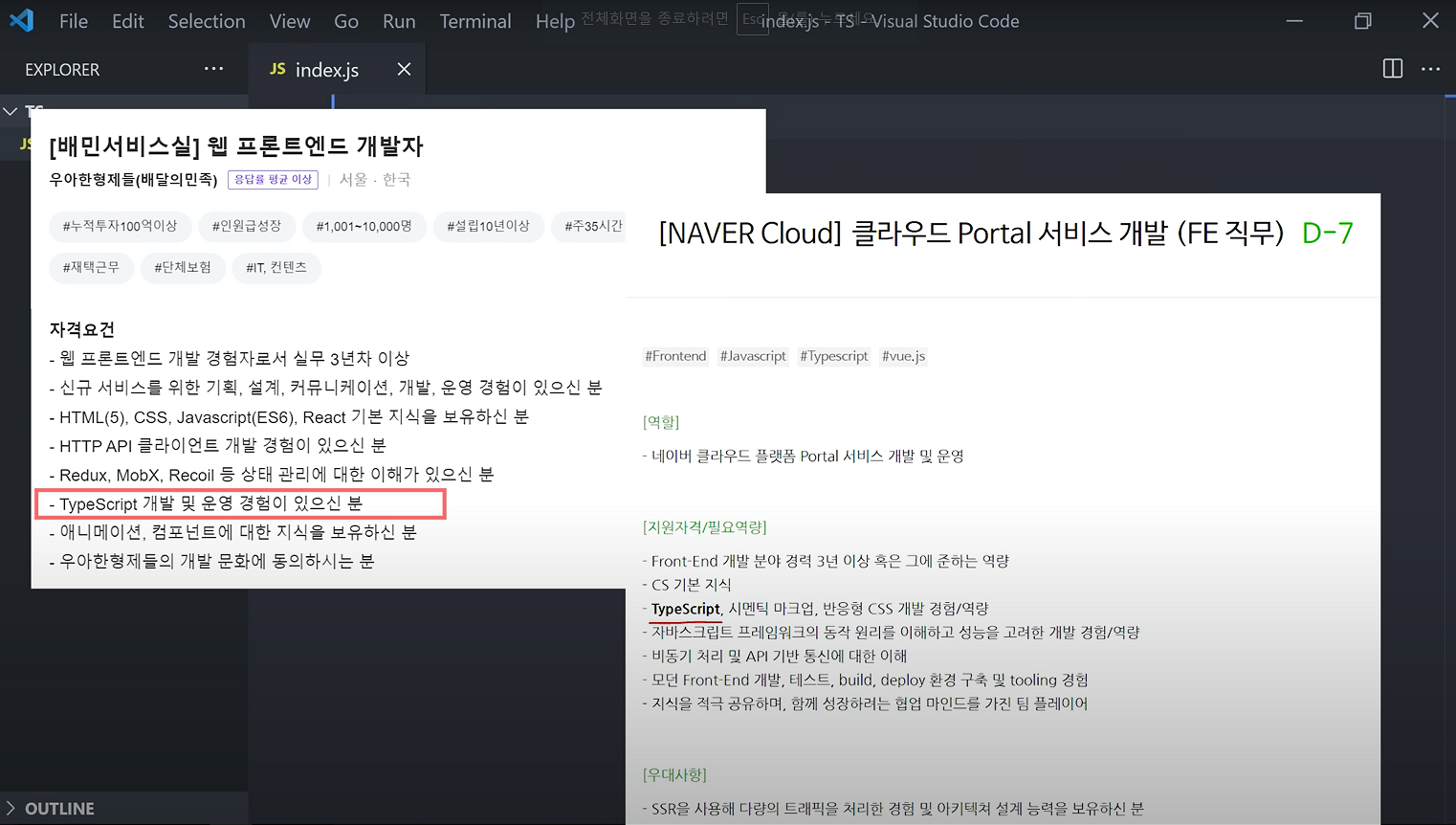 요즘 웹 개발자 채용 공고를 보면 다 대부분 타입스크립트를 어느정도 일정부분 요구하고 있습니다.