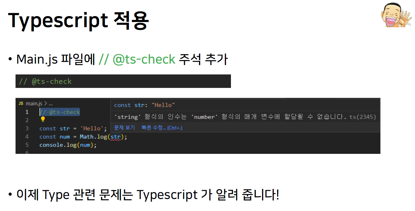그래서 타입스크립트를 언어보다는 일종의 코드 에디터 부가기능 역할로 봐도 될 것 같아요. 오타 잡아주고 그런!