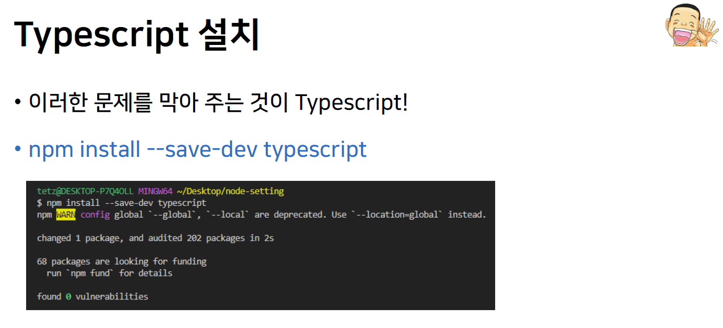 타입스크립트를 쓰기 위한 개발환경 세팅은 첫 번째 Node.js 설치 해야하구요. 최신버전 설치해주세요. 안그럼 에러남!