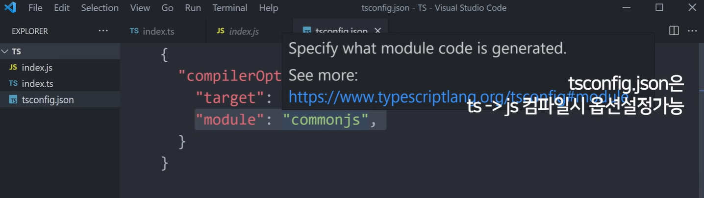 바로 이 컴파일 할 때, 그 옵션들을 tsconfig.json 여기다가 보통 기입을 합니다.